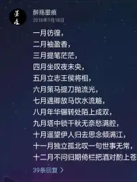 一月彷徨, 二月袖盈香, 三月提笔茫茫, 四月坐叹夜未央, 五月立志王侯将相, 六月策马提刀抛流光, 七月遇卿放马饮水流觞, 八月年华辗转处陌上成双, 九月塔中锁千秋无奈愁满腔, 十月遥望伊人归去思念倾满江, 十一月独立孤北叹一句世事无常, 十二月不问归期倚栏把酒对酌上苍。