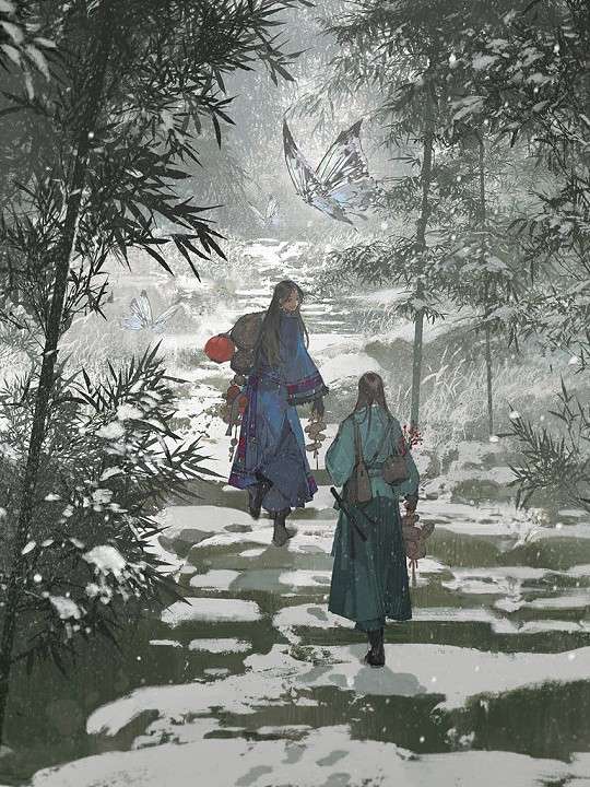 雨雾洗褪暖意,青石长桥,直矗往云深处。那一黑袍一红衣,一牛一狗,像墨水随意滴落上白宣,渲染来开。